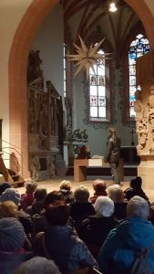 Nach dem Abschluss Segen von Herrn Pfarrer Zell machten wir uns auf den Weg in die Altstadt von Michelstadt um dort noch eine evangelische Kirche zu besuchen. Auch hier hatten wir in unserem “Stadtführer” Andreas Kaliwoda einen guten Erklärer! Vieles erfuhren wir über diese schon sehr alte, vormals katholische Kirche. Leider lud das Wetter nicht zum Bummeln ein, so dass wir froh waren im Cafe Orth in Bad König ein trockenes, warmes Plätzchen zu finden. Bei leckeren Kuchen und Kaffee oder Tee war es schön gemeinsam mit Frauen aus anderen Zweigvereinen zusammen zu sitzen und sich dabei kennen zu lernen.
